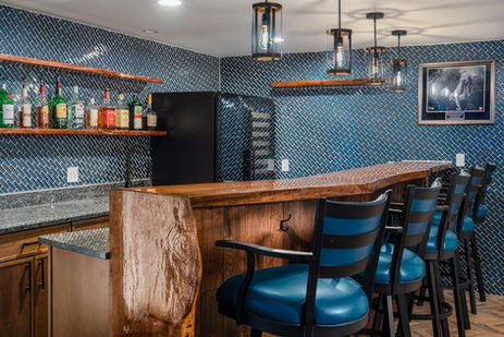 Requesting a blend of modern + rustic aesthetics; we paired cool grays with warm wood tones and blue accents. Featuring wood-look chevron tile flooring, blue glass mosaic backsplash tile, a custom built bar capped with a maple live-edge waterfall bar top, matching live-edge shelving throughout the room, and accent walls to add visual interest -- this basement lounge feels both high-end and cozy.