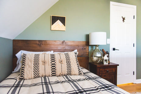 With the design vision of creating a lakes + mountains themed home blending rustic and modern elements -- every surface was scrubbed clean and painted, floor replaced, and budget-friendly updates were made in the kitchen and bathroom including new countertops and decorative wall coverings. Using a discounted load of rough sawn lumber; Hilary installed wood accent walls in the living room to add a touch of warmth and character to an otherwise all-drywall home.