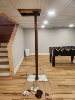 My out-of-state clients had worked hard to finish the basement in their Maine cabin during a marathon week-long 'work trip', but ran out of time. They hired us to hang the wall art + decor, as well as complete a punch-list of little finishing touches including a small paint project, installing a wood ceiling in a stair well, swapping out a light fixture, and taking final photos for their rental listing.